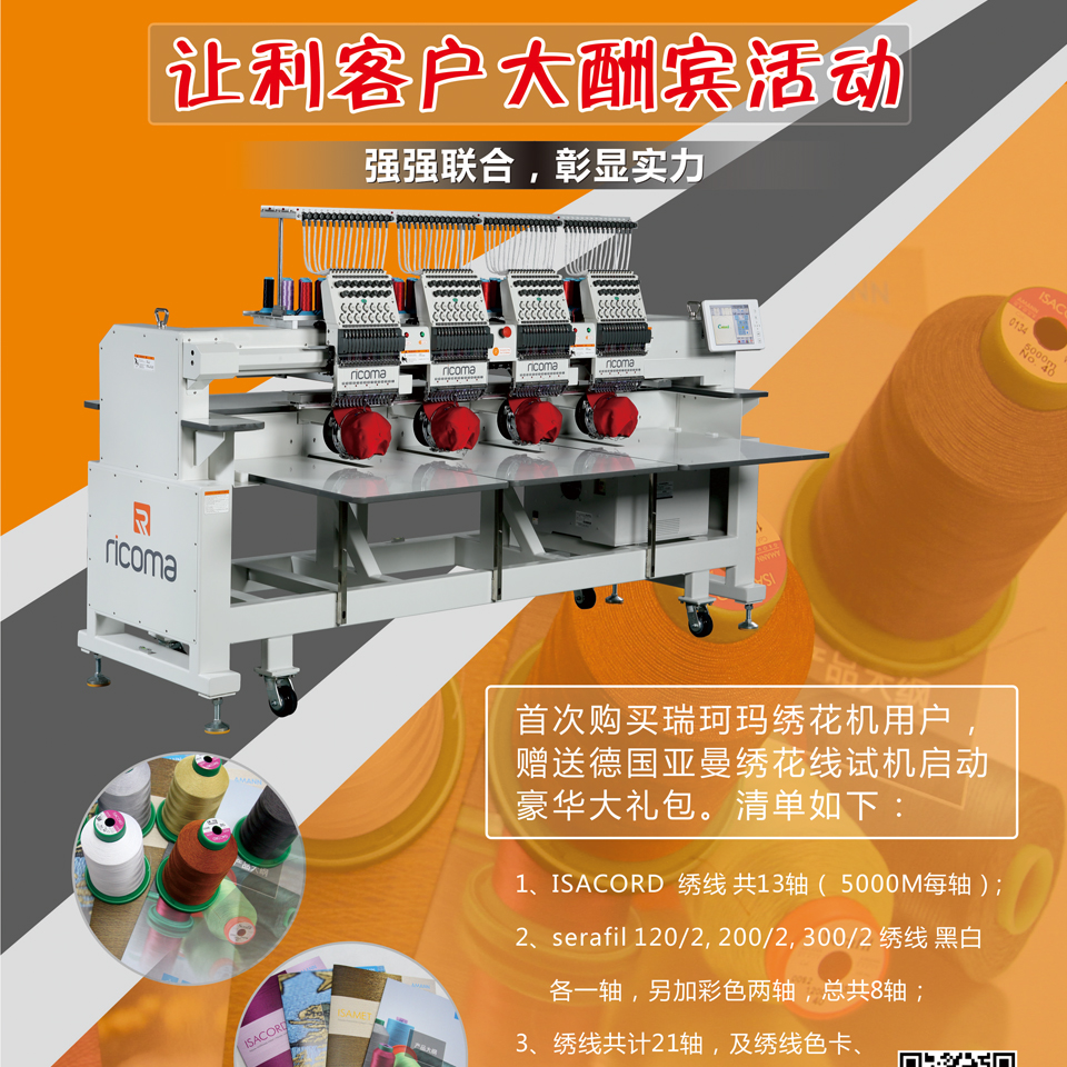 首次购买瑞珂玛绣花机用户,赠送德国亚曼绣花线试机启动豪华大礼包。