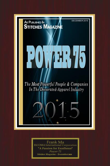 12/2015 -FOR 5 STRAIGHT YEARS, RiCOMA PRESIDENT, FRANK MA, IS NAMED ONE OF STITCHES MAGAZINE TOP 75 POWER PLAYERS! Stitches reveals its sixth-annual list of the most powerful people and companies in the industry today. Ranked from one to 75, everyone on this list is influencing the direction the decorating industry will take in 2016 and beyond.